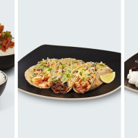 Choose a grilled chicken, ribeye steak, or shrimp taco in a corn-flour blend tortilla with sesame slaw, green onions, and spicy Boom Boom sauce; plant-based options available.
